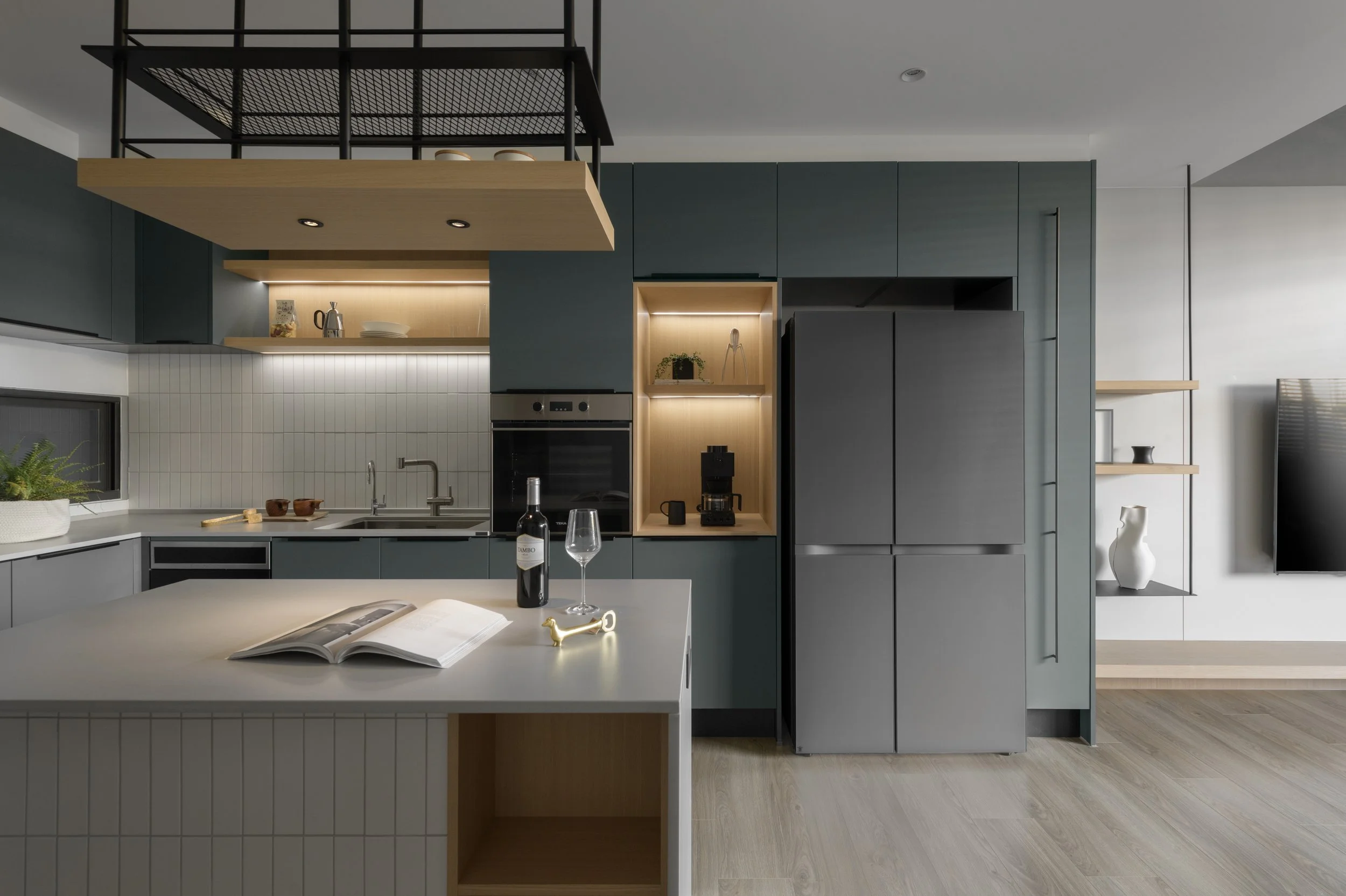 作為空間主角的廚房,規劃大量機能櫃體以強化收納,中島設計融入鐵件吊架,不僅提升視覺焦點,更兼具實用機能。